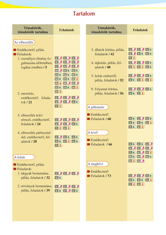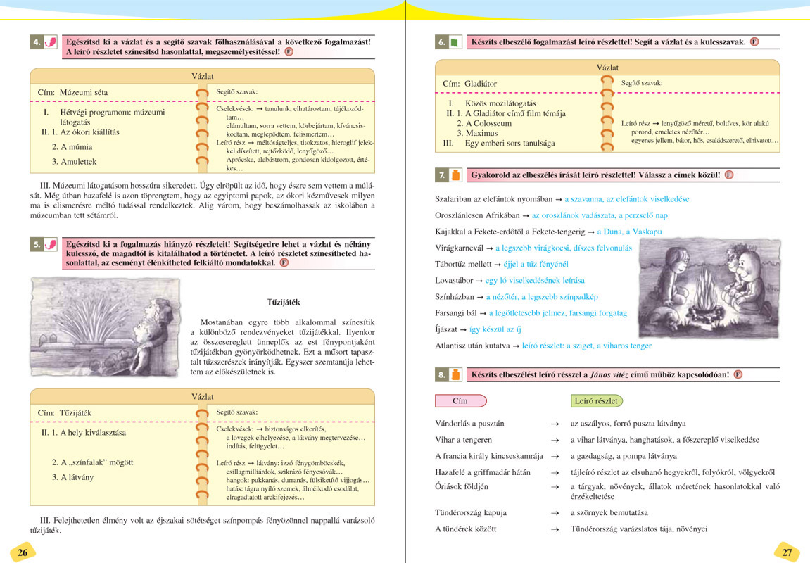 A sorozat első kötetében öt műfajjal (elbeszélés, leírás, jellemzés, levél, meghívó) ismerkedhetnek meg azok a tanulók, akik felzárkóztatásra szorulnak, vagy éppen a tehetségüket szeretnék kibontakoztatni. A példaszövegek és a feladatok szorosan kapcsolódnak az irodalom tantárgy kerettantervi témaköreihez, pl. Molnár Ferenc Pál utcai fiúk; Móra Ferenc Mujkó; Petőfi Sándor János vitéz című művéhez. A szerző logikusan egymásra épített feladatok segítségével fokozatosan vezeti be a tanulókat a fogalmazás rejtelmeibe, akik otthoni gyakorlás esetén saját tempójukban, a különböző nehézségű feladatok között válogatva, teljesítménykényszer nélkül gyakorolhatják be a nem is könnyű lépéseket.