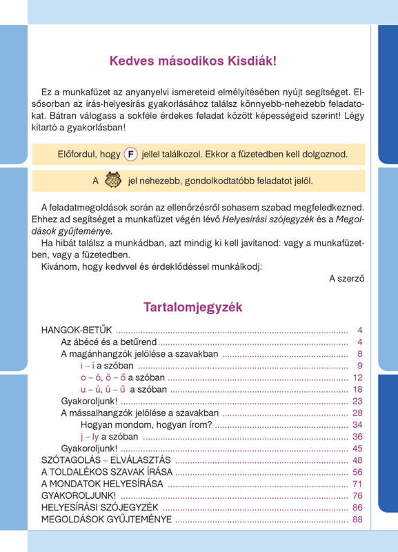A sorozat másodikosoknak készült része két kötetből áll. A második kötet olyan játékos, differenciált feladatokat tartalmaz, amelyek az alábbi témakörök elsajátítását, gyakorlását és ismétlését teszik lehetővé: az ábécé és a betűrend, a magánhangzók és a mássalhangzók jelölése a szavakban, szótagolás-elválasztás, a toldalékos szavak írása, a mondatok helyesírása.