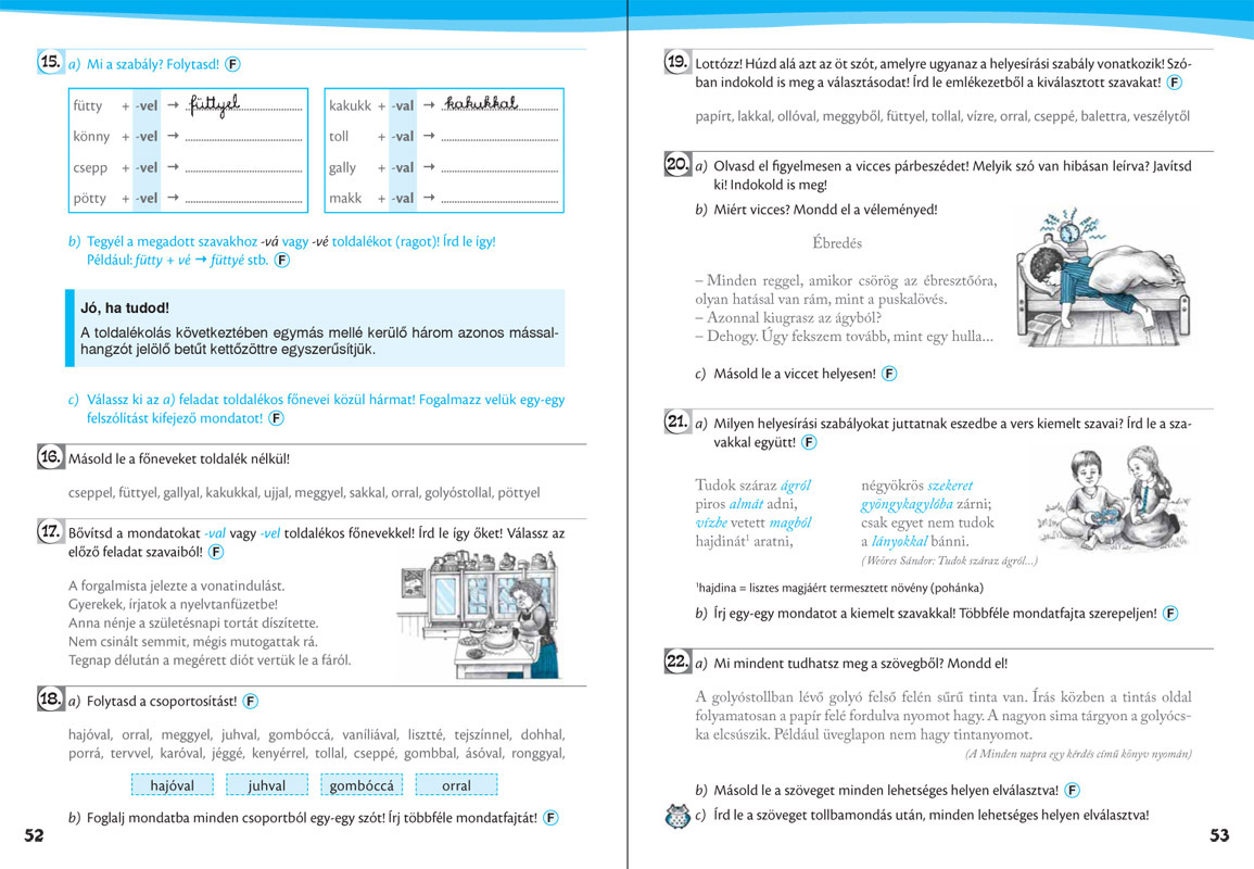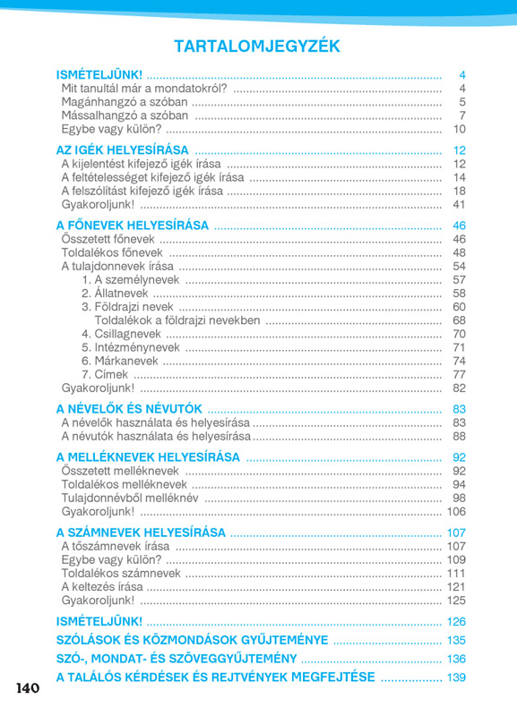 Olyan játékos, differenciált feladatokat tartalmaz a könyv, amelyek a következő témakörök elsajátítását, gyakorlását és ismétlését teszik lehetővé: az igék, a főnevek, a névelők és névutók, a melléknevek, a számnevek helyesírása.