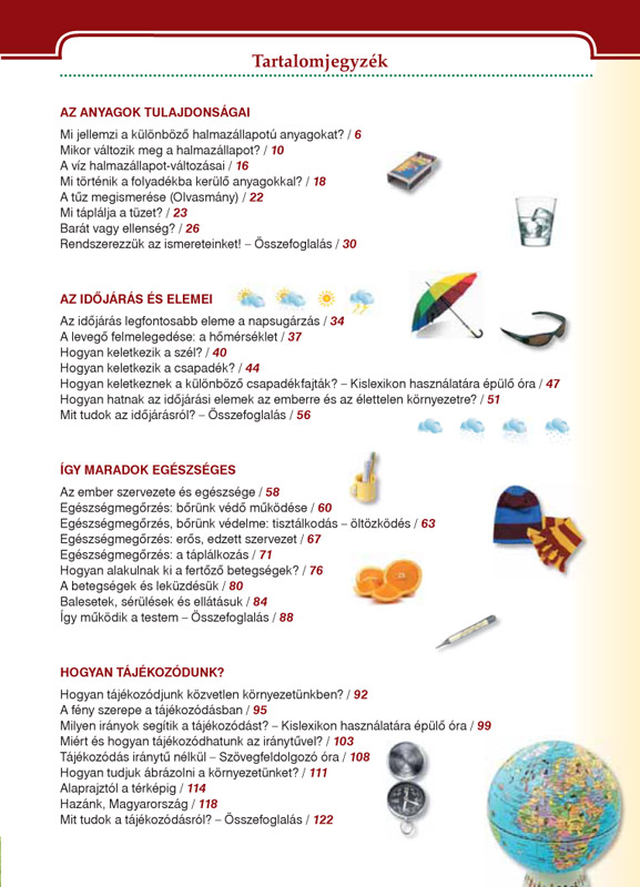 A munkatankönyv első kötetében a tanulók továbbra is elsősorban saját tapasztalataikra, élményeikre építhetnek. Felfedezhetik a közvetlen környezetükben lévő anyagok újabb tulajdonságait. Megismerkedhetnek az időjárási jelenségekkel, a tájékozódás alapjaival és legfontosabb eszközeivel: az iránytűvel és a térképpel, valamint hazánk fővárosával, Budapesttel. Az élettelen környezet mellett természetesen foglalkoznak az élővilággal is. Sokat megtudhatnak az emberi szervezet működéséről, az egészségmegőrzés sokféle lehetőségéről. A tanulási módszerek között a megfigyelés, a mérés, a kísérlet, és az önálló tanulásra ösztönző gyűjtőmunka hangsúlyos.