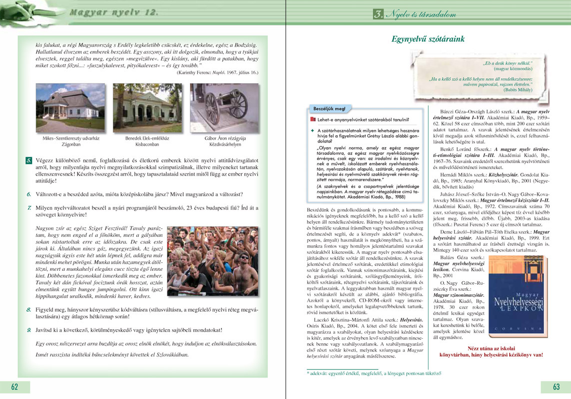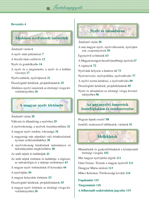 A minősített tankönyv felépítése az előző kerettanterveket [OM 17/2004 (V. 20.) 3. számú melléklete] követi, fogalomrendszere gazdagabb. Három témakör (Általános nyelvészeti ismeretek, A magyar nyelv története, Nyelv és társadalom) feldolgozását teszi lehetővé. Elméleti tudnivalókat és gyakorlati feladatokat egyaránt tartalmaz. Ez utóbbiak sokszor a tanulók mindennapi tapasztalatait hívják elő. A tankönyv végén ismétlő-rendszerező táblázatok, vázlatok is helyet kaptak, melyek hasonló célt szolgálnak, mint a tananyag és a gyakorlatok vizsgaszintek szerinti megkülönböztetése: azt, hogy az érettségizők minél hatékonyabban tudjanak felkészülni az általuk választott vizsgaszintre.