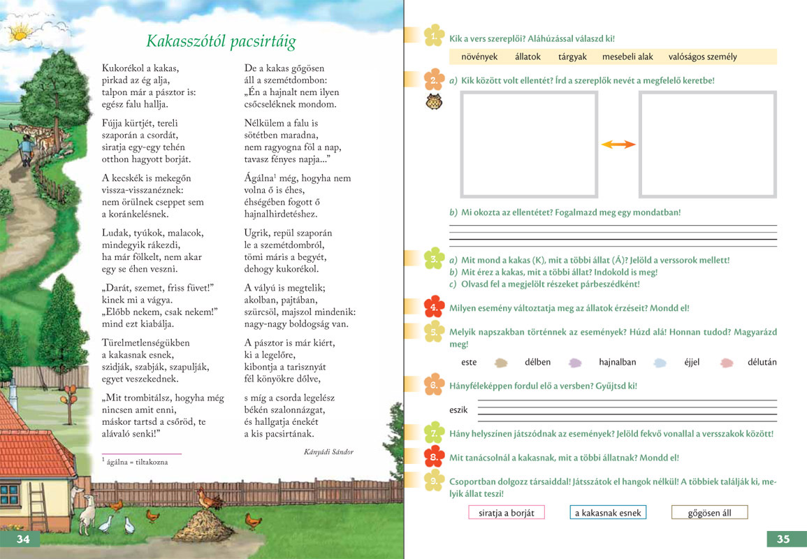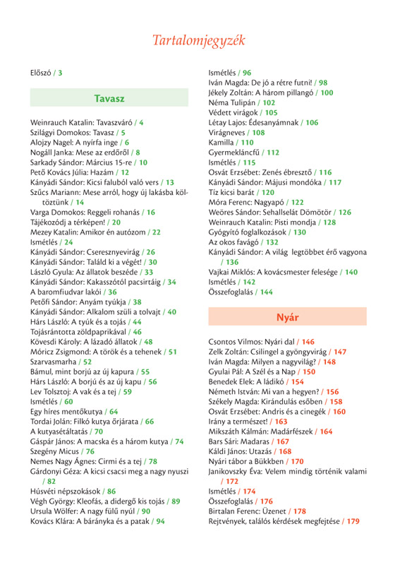 A másodikosok számára készült olvasókönyv két, szerkezetileg összetartozó kötetből áll. Szövegei és feladatai az olvasást, az írott szöveg megértését, a szóbeli szövegalkotás és beszédkészség fejlesztését szolgálják. A szövegválogatás az évszakok váltásához igazodik, köznyelvi, ismeretterjesztő és szépirodalmi művek műfajilag is gazdag választékát adja. A tanulók sokféle – szóbeli és írásbeli – lehetőséget kapnak e szövegek változatos feldolgozásához, pl. tartalom összefoglalása, lényegkiemelés, saját vélemény megfogalmazása, szerepek szerinti előadás, logikai sorrend megállapítása, szövegek kiegészítése, bekezdések jelölése, titkosírás, keresztrejtvény, kézikönyvek használata. A második kötet a tavaszhoz és a nyárhoz kapcsolódó szemelvényeket tartalmazza.