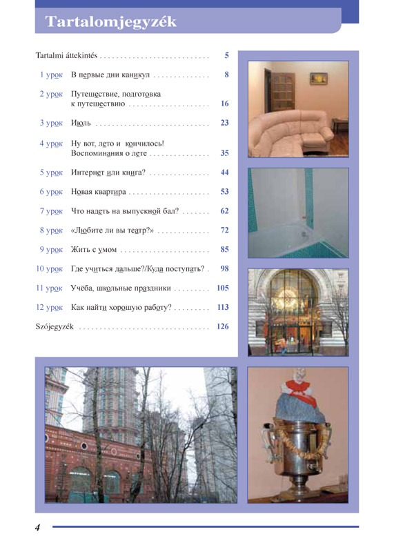 A sorozat utolsó részében hőseinkkel együtt átéljük a lakásfelújítás kellemetlenségeit, a külföldi utazás megszervezését és élményeit, ellátogatunk a Bajkál-tóhoz és Szocsiba, szembesülünk a természet- és környezetvédelem problémáival. Elkísérjük őket könyvtárba, színházba, ruhavásárlásra. Szót ejtünk táncról, sportról, iskolai ünnepekről, és természetesen vizsgákról, pályaválasztásról, álláskeresésről. Eközben újabb beszédfordulatokkal leszünk gazdagabbak. Gyakorlatra teszünk szert az eddig még nem ismert névmások, az igekötős mozgást jelentő igék használatában, a függő beszéd alkalmazásában. Eligazodunk az ok- és cél-, az idő- és helyviszonyok kifejezésének lehetőségeiben, képesek leszünk a tulajdonságok összevetésére és a magyartól eltérő igevonzatok alkalmazására. A nyelvkönyvhöz hanganyag kapcsolódik, amely letölthető.