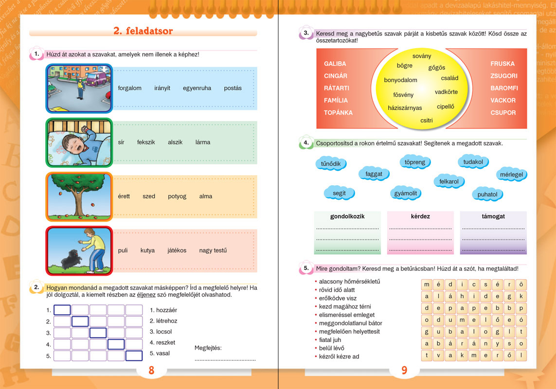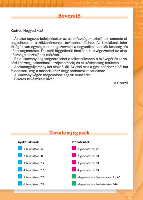 A szerző hat gyakorlatsort és négy próbatesztet állított össze a szövegértés (olvasási készség, szinonimák, szójelentések) és az íráskészség fejlesztéséhez.