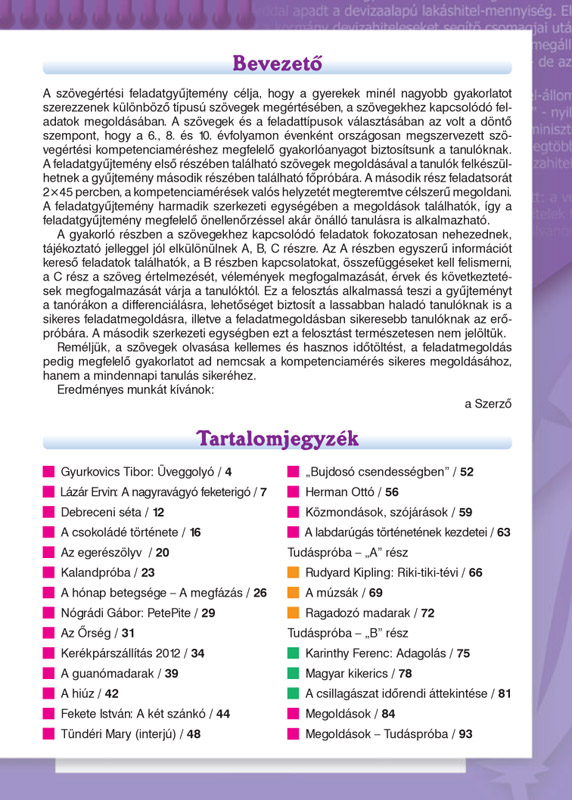 A szövegértési feladatgyűjtemény célja, hogy a diákok minél nagyobb gyakorlatot szerezzenek a különböző típusú szövegek megértésében, a szövegekhez kapcsolódó feladatok feldolgozásában. A szövegek és a feladattípusok választásában az volt a döntő szempont, hogy a 6. évfolyamon évenként országosan megszervezett szövegértési kompetenciaméréshez megfelelő gyakorlóanyagot biztosítsunk a diákoknak. A feladatgyűjtemény első részében található szövegek megoldásával a tanulók felkészülhetnek a gyűjtemény második részében található főpróbára. A második rész feladatsorát 2x45 percben, a kompetenciamérések valós helyzetét megteremtve célszerű megoldani. A feladatgyűjtemény harmadik szerkezeti egységében a megoldások találhatók, így a feladatgyűjtemény megfelelő önellenőrzésre, akár önálló munkára is alkalmazható.