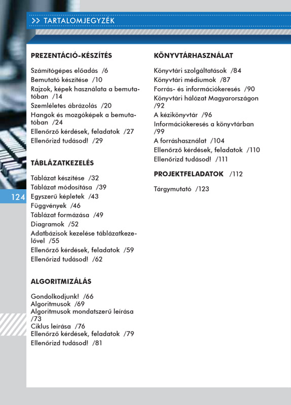 A tizedikes korosztály nyelvi fejlettségéhez jól igazodó, olvasmányos tankönyv a gyakorlatot állítja a középpontba. Bővíti az előző évben szerzett informatikai ismereteket. Az előző kerettanterv [OM 17/2004. (V. 20.)] tartalmára és követelményrendszerére épül. Megtanítja, hogyan lehet előadásainkat a számítógép használatával érdekesebbé tenni. Foglalkozik azzal, hogyan lehet az adatokat táblázatos formába rendezni, azokkal számolni, és belőlük szemléletes diagramokat készíteni. Megtanítja, hogyan lehet a tevékenységeket lépésekre bontani, algoritmusokat létrehozni és leírni. Azzal is foglalkozik, hogyan lehet ismereteinket a könyvtár használatával bővíteni.