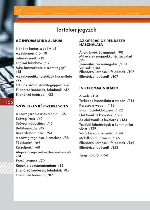 A kilencedikes korosztály nyelvi fejlettségéhez jól igazodó, olvasmányos tankönyv a gyakorlatot állítja a középpontba. Az előző kerettanterv [OM 17/2004. (V. 20.)] tartalmára és követelményrendszerére épül. Foglalkozik az informatika alapjaival, az operációs rendszerrel, a szöveg- és képszerkesztéssel, illetve az internet felhasználási lehetőségeivel. Ennek megfelelően a leckék is négy fejezetbe rendeződnek. Az ismeretek átadásában kulcsszerepet a feladatok játszanak, amelyek életszerűek, praktikus szemléletet közvetítenek, a tanulók saját tapasztalatait is előhívják, tehát maradandóbb tudást eredményeznek.