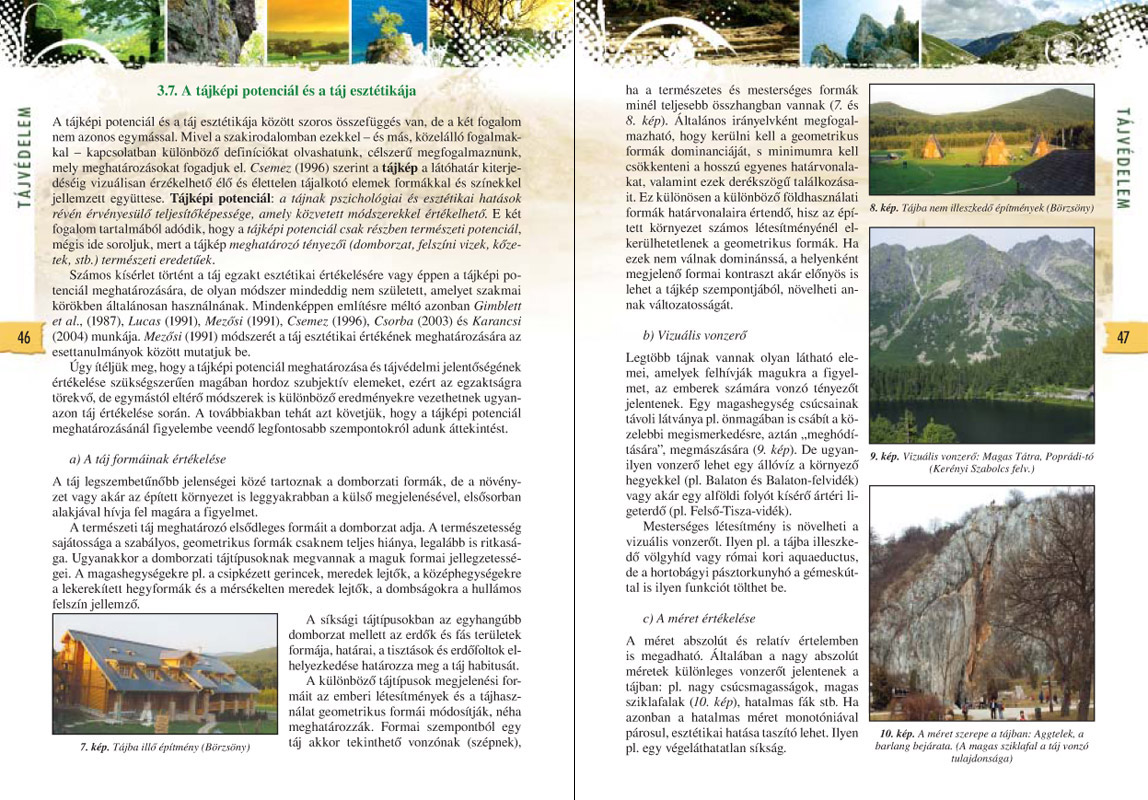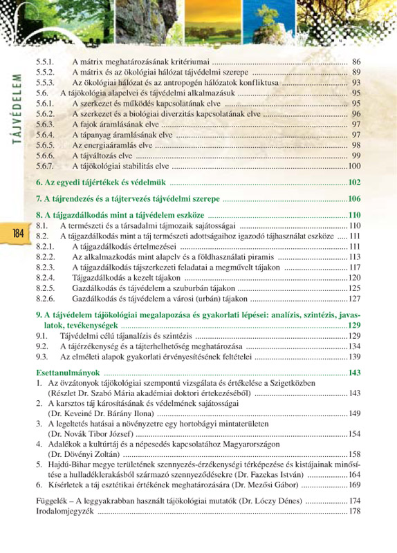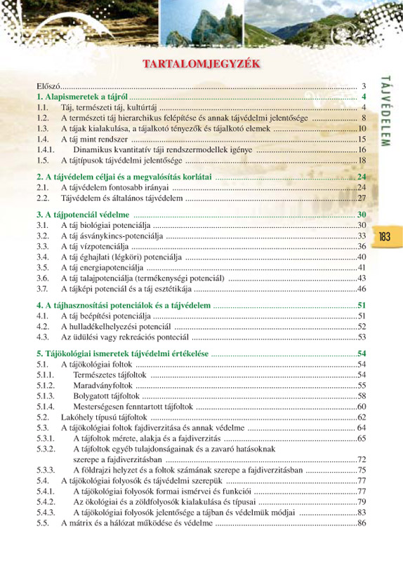 A kötet a tájvédelem tantárgy alapvető ismeretanyagát foglalja magában. Röviden feleleveníti a legfontosabb tájföldrajzi és tájökológiai alapismereteket, továbbá ezekből vezeti le a tájvédelmi alkalmazás alapelveit, s fogalmazza meg az ezzel kapcsolatos gyakorlati teendőket. Arra is törekszik, hogy kapcsolatot teremtsen a tudományos ismeretek és a tájvédelem jogi intézményrendszere, valamint a tájakkal kapcsolatos, átfogó programok között. A kötet elsősorban a geográfusképzésben hasznosítható, de a földrajztanárok képzését, sőt a tanártovábbképzést is szolgálja. Az ismeretanyagban a táj élő rendszerei is hangsúlyt kapnak, ezért biológiatanárok figyelmébe is ajánljuk.