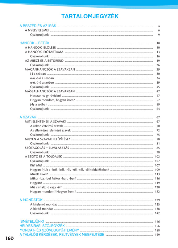 A könyv végén Helyesírási szójegyzék, Mondat- és szöveggyűjtemény található.