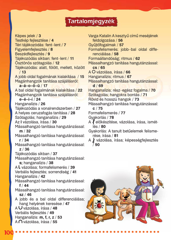 A kiadványban szerepelnek az írás-olvasás készség-képesség fejlesztése mellett, olyan feladatok is, melyek a kognitív funkciók fejlesztését segítik pl. vonal- és iránykövető feladatok, jobb-bal iránykövetés, betűelem mátrixok, rajzos, színezős feladatok, vizuális figyelmet és emlékezetet fejlesztő gyakorlatok. Nagy hangsúlyt fordított a szerző a hanganalízis-, hangazonosítási feladatokra is.