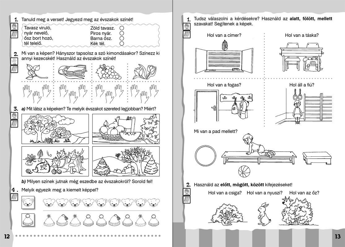 munkafüzet, 1. osztály, hang, hangokra bontás, hangkeresés, hang helyének jelölése, hanganalízis, írás, betűelem, hármas vonalrendszer, betű, szóértés, szólánc, szótag, szókapcsolat, szavak, mondat, mondatértés, kognitív funkció pl. síkbeli tájékozódás, jobb-bal iránydifferenciálás, azonosságok keresése, analízis-szintézis, helyes ceruzafogás, megfelelő testhelyzet